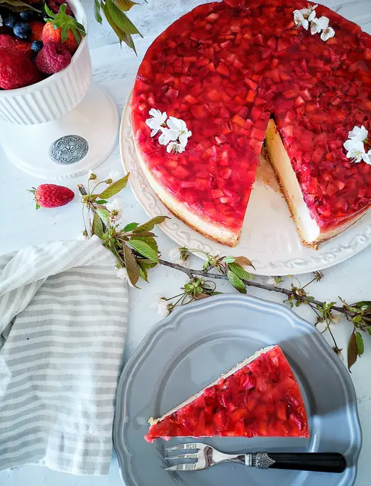 – Jagode nasjeckajte na kockice, dodajte im limunov sok, šećer u prahu i vanilin šećer. Pustite jedan sat u hladnjaku da se mariniraju, a zatim procijedite višak sokova koji su pustile i odložite sa strane. Posložite ih po ohlađenoj torti.